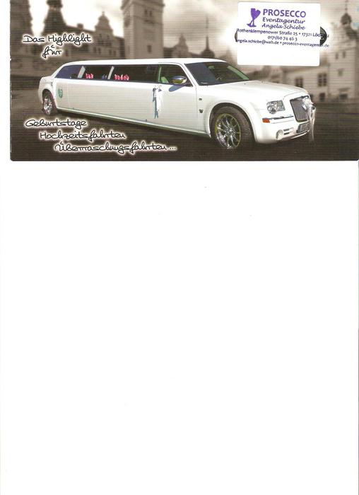Gleiten Sie in dieser tollen Limousine von Ihrer Haustür durch Ihren Ort bis zu Ihrer Partylocation. Der Chauffeur hat alles an Bord, was man für eine Fahrt in so einem Auto erwartet - Sekt, Früchte ,entsprechendes Licht und passende Musik.